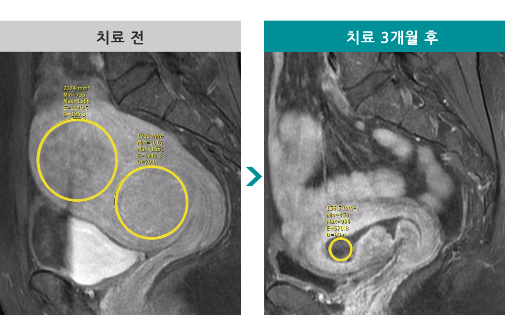 ▶ 주치의 : 김재욱 원장▶ 환자 : 46세 여성▶ 질환 종류 : 5.5cm, 5cm 크기의 두 개의 점막하근종▶ 질환으로 인한 불편증상 : 생리 불규칙, 빈혈▶ 치료 경과 : 근종 두 개 대부분 떨어져 나와 흔적만 남음. 생리 정상, 빈혈 회복됨.